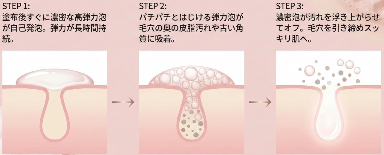 2.濃密「高弾力パチパチ泡」で毛穴ディープクレンジング